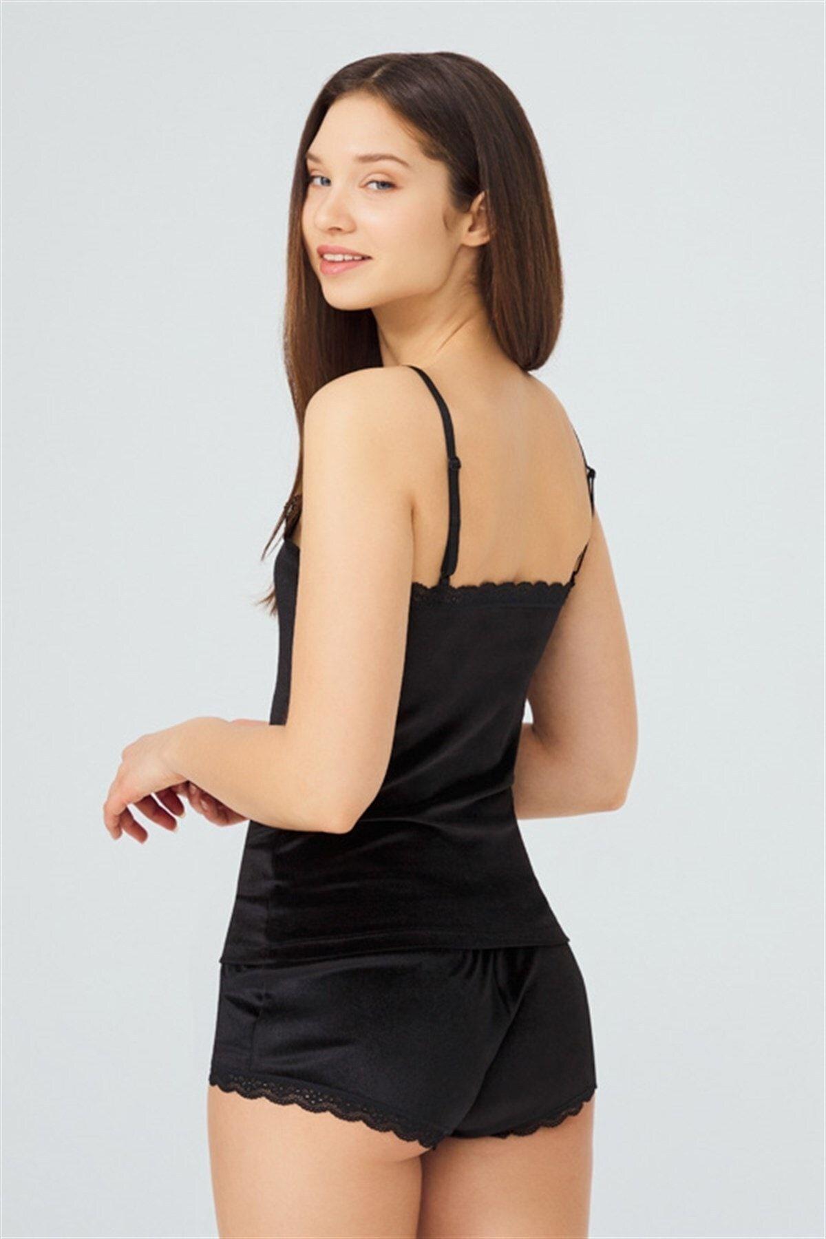 Dantel Detaylı İnce Askılı Kadife Atletli Şortlu Takım CH1501
