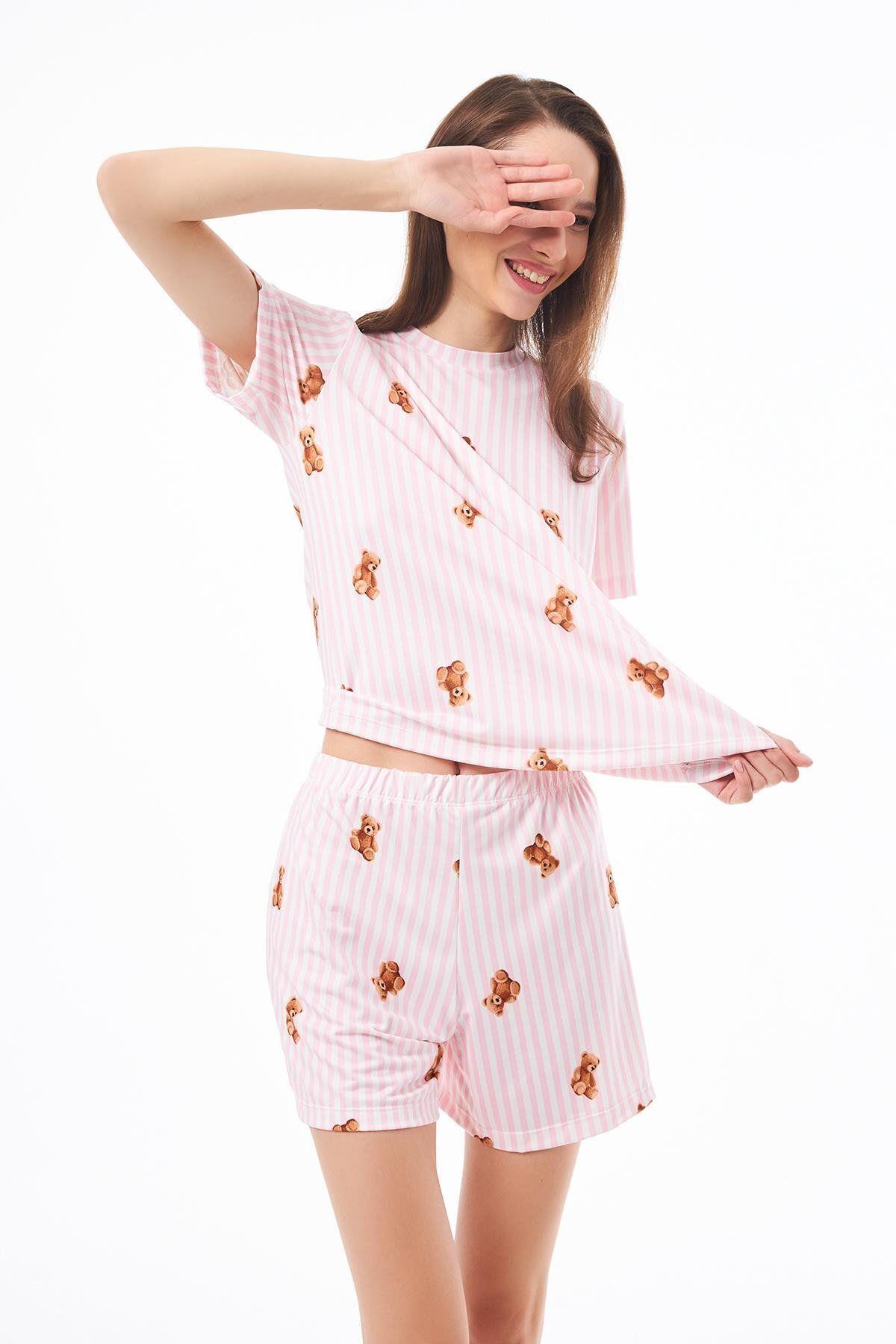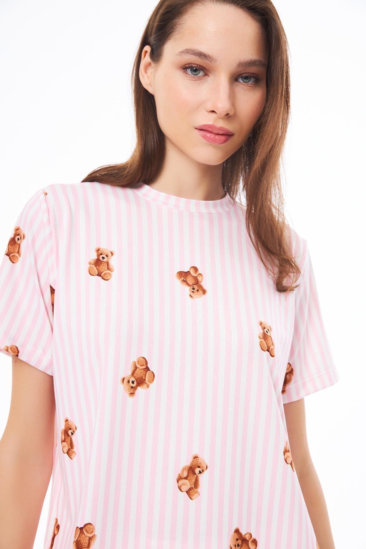 Desenli Yumuşak Dokulu Uzun Kollu Bisiklet Yaka Şortlu Pijama Takımı CH1521