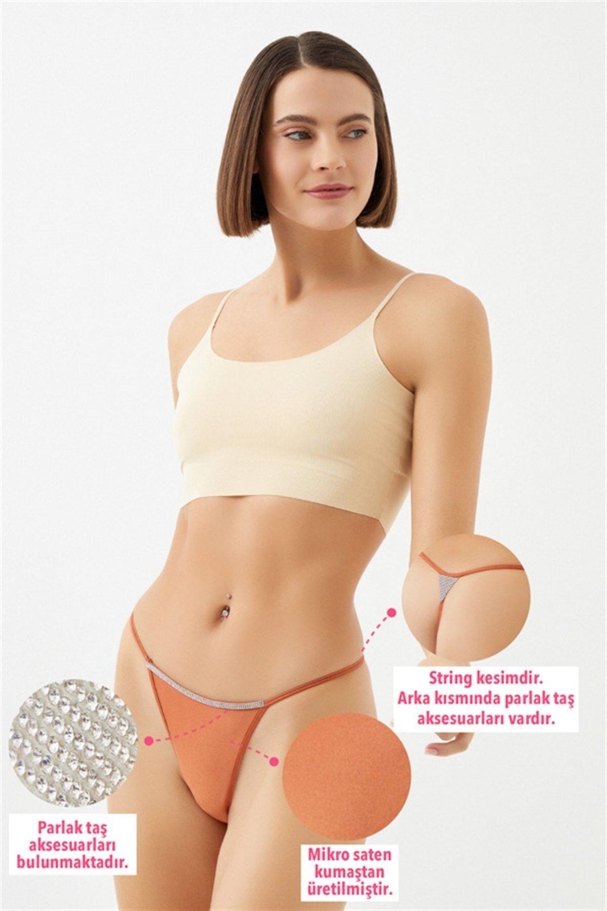 Mikro Saten Ön ve Arka Taş Detaylı Kadın String Külot CH6119