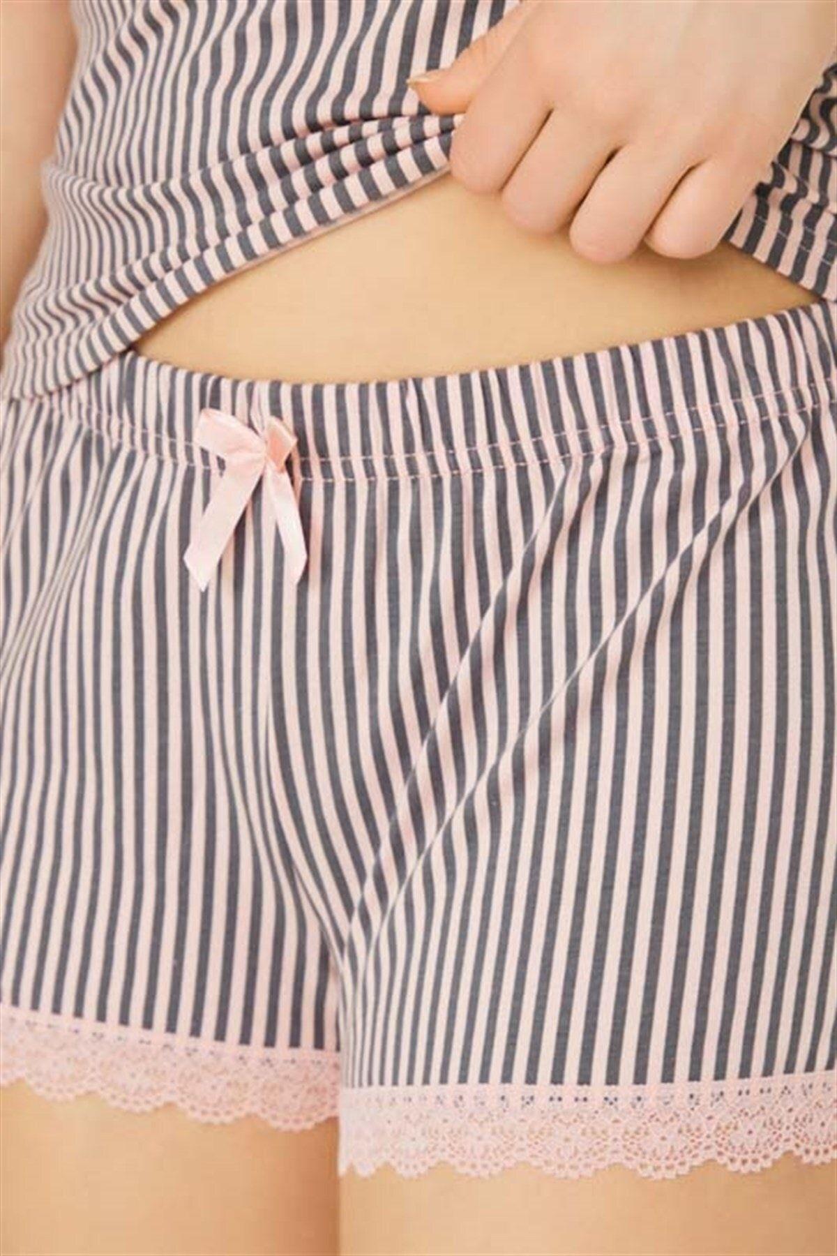 Pembe Füme Çizgili İnce Askılı Şortlu Pamuklu Pijama Takımı CH1507