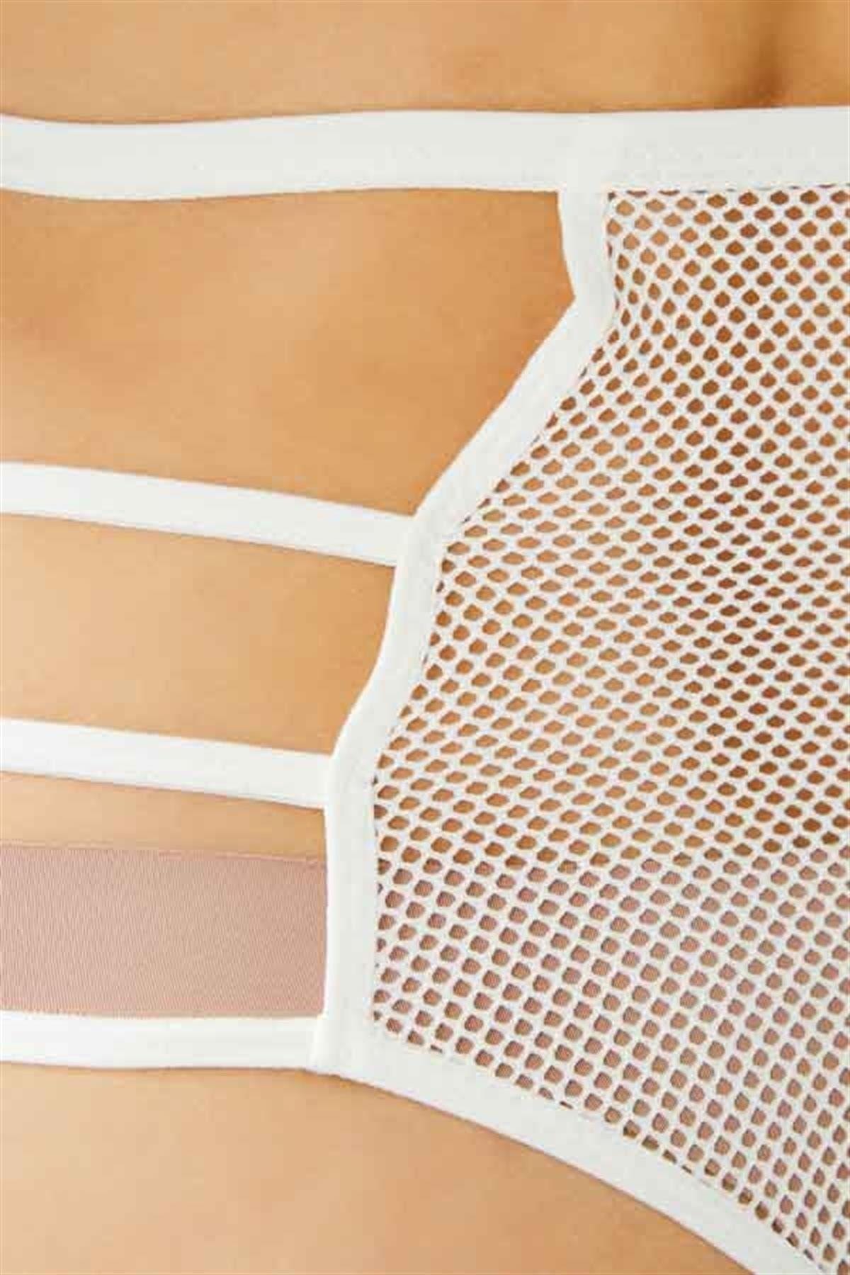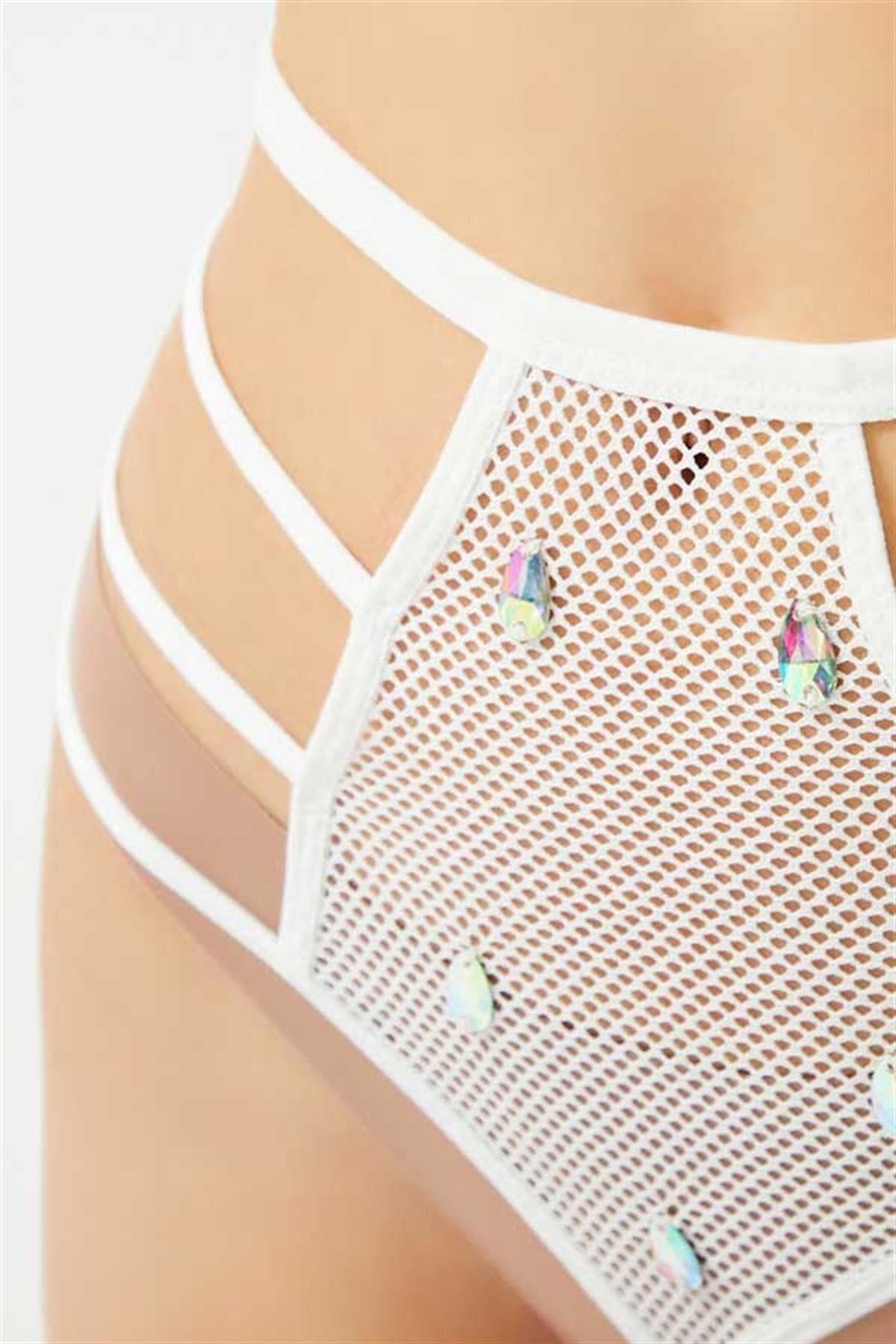 Transparan Fileli Taş ve Lastik Detaylı Yüksek Bel Kadın String Külot CH6123